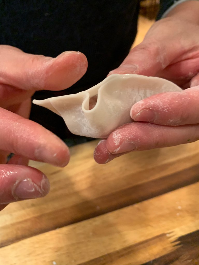 - Hold the dumpling with one hand and start sealing the edges into pleats with the other hand.