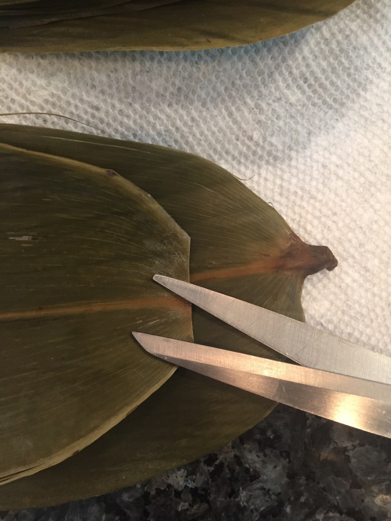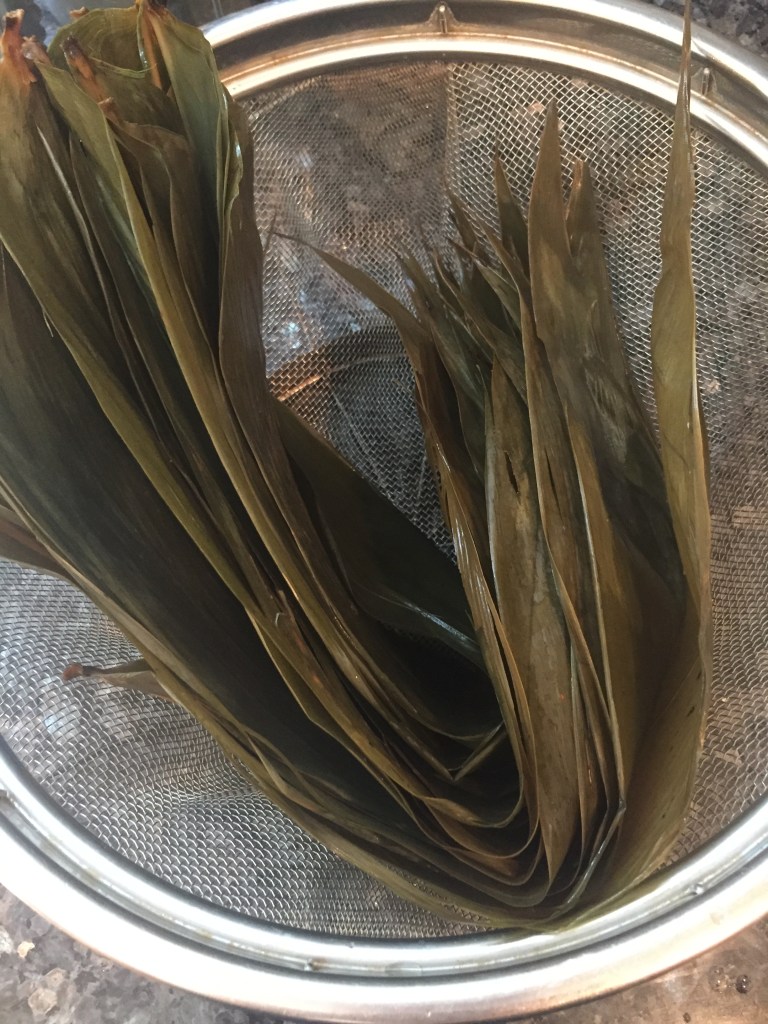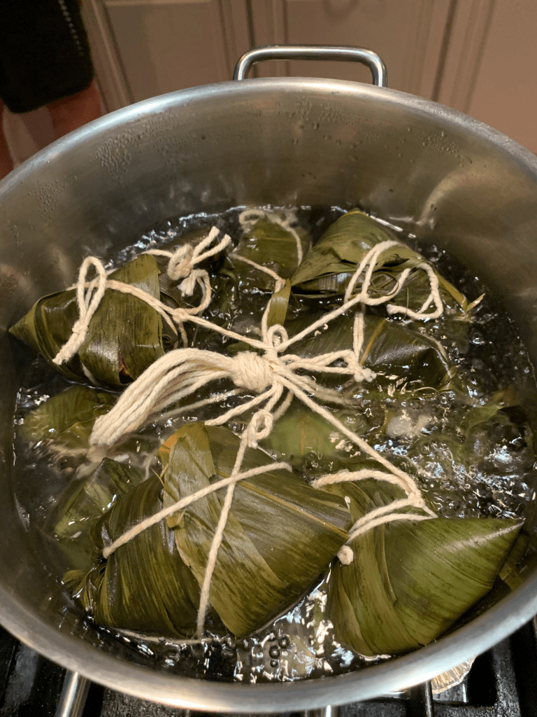 In a big pot with boiling water, drop the dozen of zong zi and their strings in the water, cover, boil for 1.5 hours, add water if needed. The zongzi should be submerged underneath the water level. Once done, take zongzi out on a plate to cool.