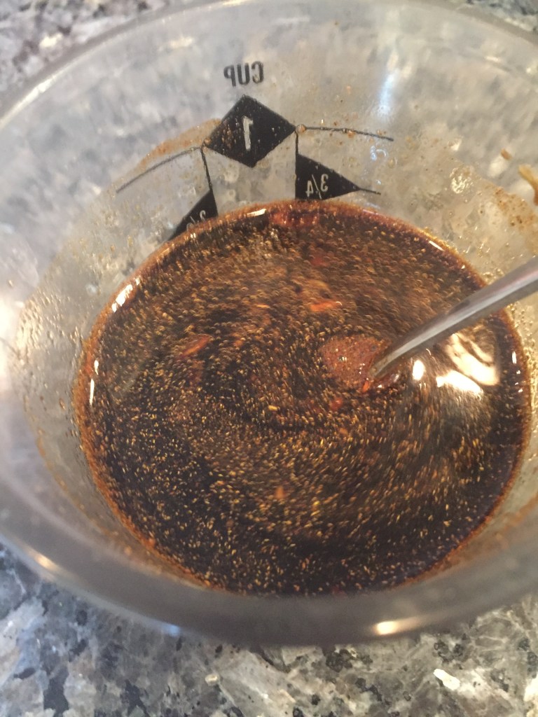 After about an hour, mix 4 TBS of soaking water with the soy sauce, then add sugar, salt, and five spice powder. Stir well.