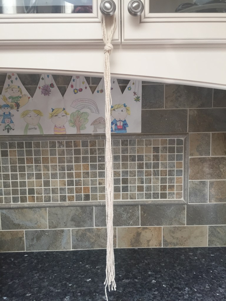 Gather all 12 strings, tie a loop knot on one end, then securely hang them on a hook, a refrigerador door, or a cabinet knob.