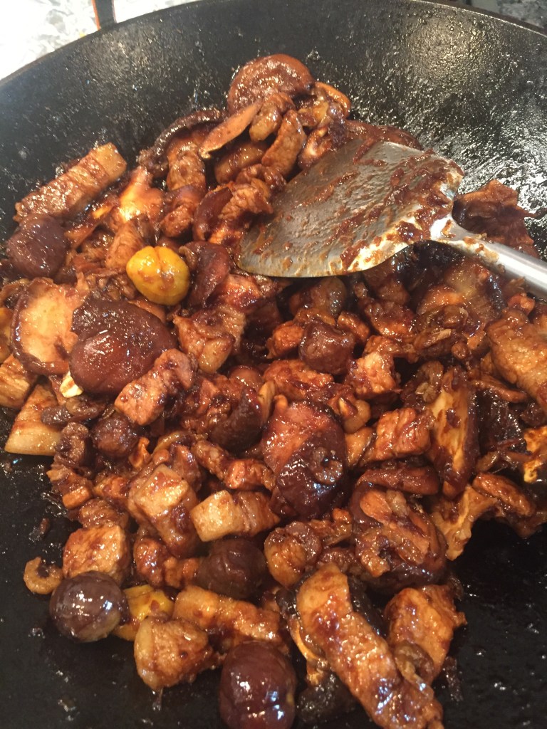 Add mushroom and chestnuts, continuing to stir fry until the ingredients glisten, a signal of complete caramelization. Set aside in a bowl.