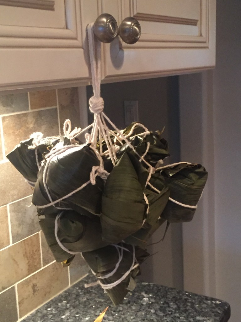 While holding the zongzi, go to the hanging string, place the zongzi half way of the string, wrapping the string around once, tug till it is snug, go around once more, them tie a knot.