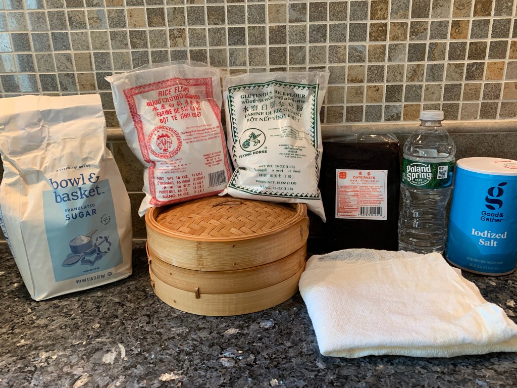 9 Take the steamed flour base out. Careful, it will be hot. Spread one portion of the jujube date paste onto the steamed base, then add another layer of the flour mix. Steam on high flame for another 5 minutes. Repeat this process of building the layers and steaming after each flour layers until you finish with all the paste and flour mix.