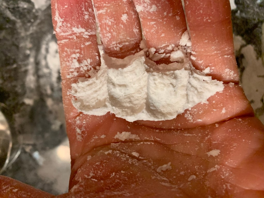 5 Perform a dough consistency test to see if you need to add more sugar water or not. Grab a palm-full of flour mix. If it holds its shape after the squeeze but crumbles between your fingers when you try to break them apart, then the dough is ready.
