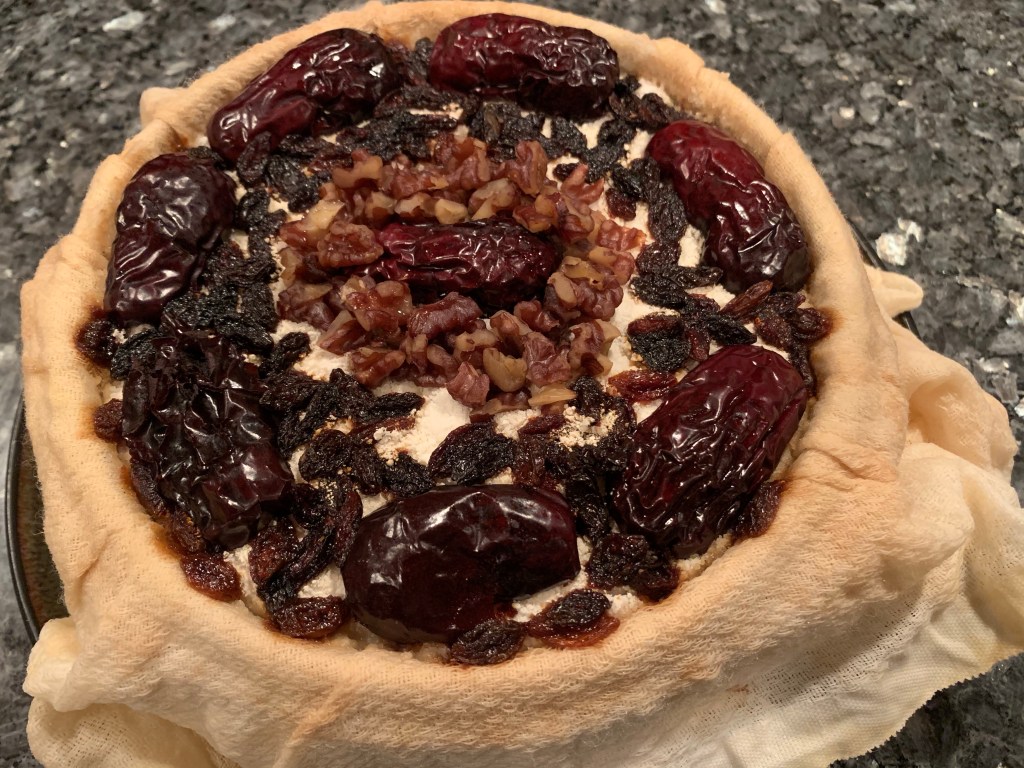 10 Your last layer which is the top layer of the cake should be the flour layer. Now it is time to decorate the cake before we steam it for one last time. We used halved jujube dates, dried Goji berries, and chopped walnuts on ours.